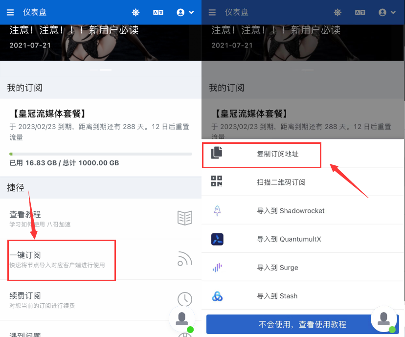 点击左上角三个横杠 - 进入仪表盘 - 点击一键订阅 - 选择复制订阅地址