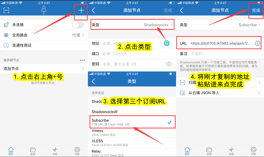 打开小火箭首页右上角+号 - 类型选择第三个订阅URL - 将刚才复制的链接粘贴进来-点击右上角完成