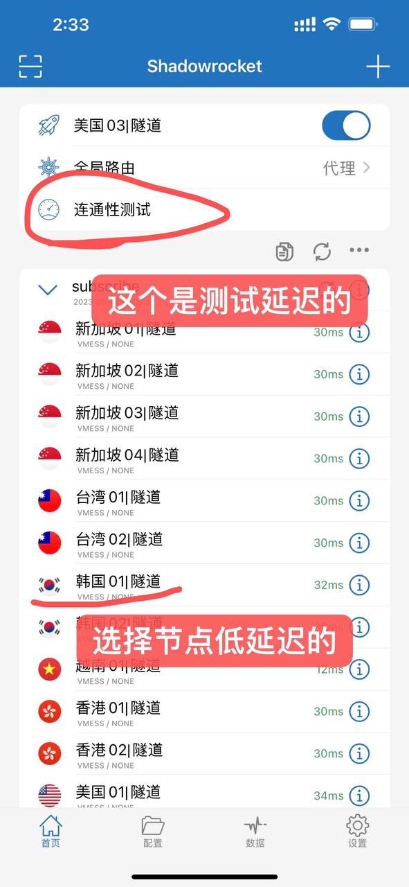 3 点击 联通性测试 选选择好延迟低的线路 比如 美国 日本