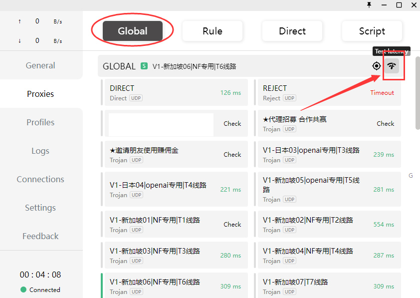 3、左侧点击【Proxies】,点击全局模式【GLOBAL】,点击测速即可